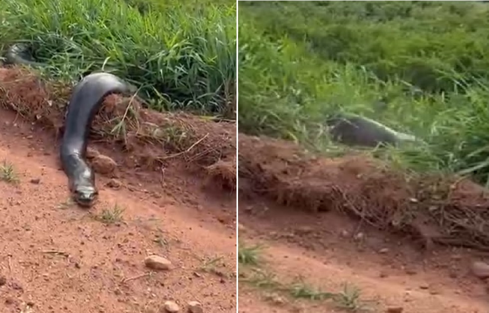 De acordo com informações, a cobra tentava atravessar a estrada, chamando a atenção de motoristas e pedestres que passavam pelo local. Apesar do tamanho impressionante, o animal não representou risco e acabou retornando para a mata.
