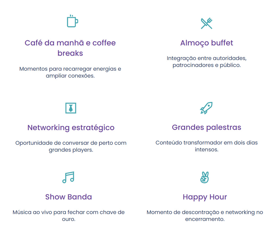 O evento vai além do palco principal: são dois dias com coffee breaks, almoço de networking, estandes interativos de marcas parceiras, sorteios, música ao vivo e um ambiente cuidadosamente preparado para fomentar conexões reais.