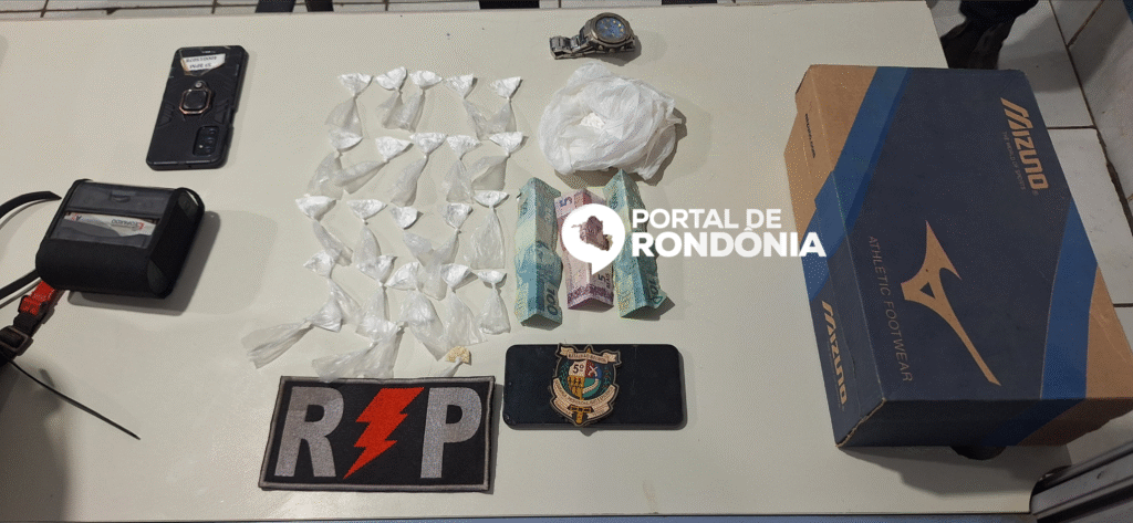 Os policiais se deslocaram até a região, onde flagraram o jovem com várias porções de cocaína, uma quantia em dinheiro trocado, além de objetos de procedência duvidosa.