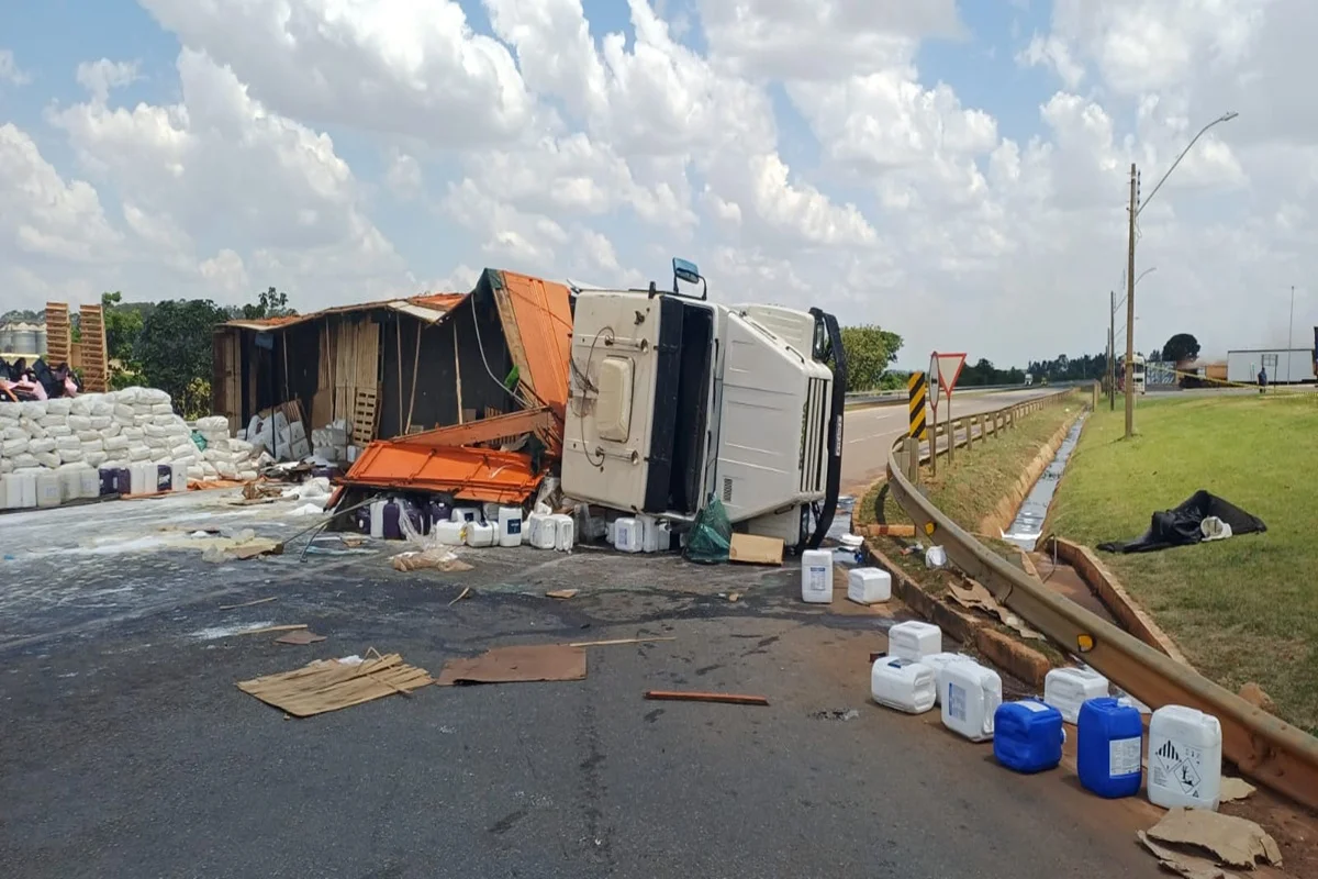O caminhão que tombou levava galões de agrotóxico e seguia no sentido Brasília. O motorista perdeu o controle, atravessou o canteiro central e tombou na pista contrária (sentido Catalão).