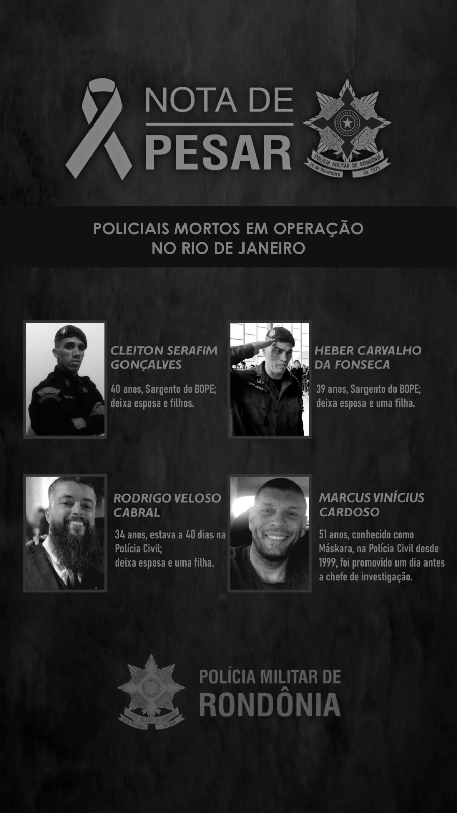 A Polícia Militar de Rondônia manifesta profundo pesar pelo falecimento de policiais civis e militares do Estado do Rio de Janeiro, que perderam a vida durante uma operação policial realizada no dia 28 de outubro de 2025. Foram vítimas os policiais civis Marcus Vinícius Cardoso de Carvalho, de 51 anos, Comissário da 53ª Delegacia de Polícia (Mesquita), e Rodrigo Velloso Cabral, de 34 anos, lotado na 39ª Delegacia de Polícia (Pavuna); e os policiais militares 3º Sargento Cleiton Serafim Gonçalves, de 42 anos, integrante do BOPE, que ingressou na Corporação em 2008, deixando esposa e uma filha, e o 3º Sargento Heber Carvalho da Fonseca, de 39 anos, também integrante do BOPE, que ingressou na Corporação em 2011, deixando esposa, dois filhos e um enteado.