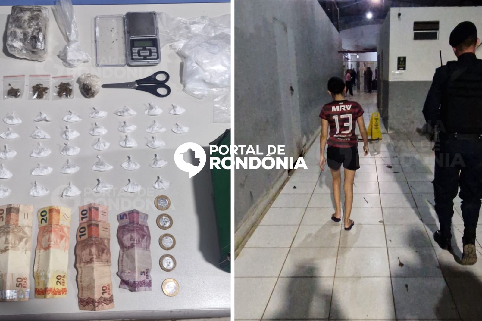 Durante a revista no imóvel, os policiais encontraram uma bolsa feminina sobre uma cômoda no quarto da suspeita. Dentro dela, foram localizadas 32 porções de cocaína, quatro porções de maconha, uma balança de precisão, saquinhos plásticos utilizados para embalar entorpecentes e R$ 100 em dinheiro trocado, confirmando a prática do tráfico.