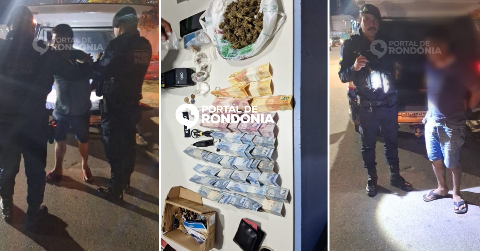 Durante as buscas, os militares encontraram várias porções de maconha, cocaína, além de dinheiro trocado, uma balança de precisão, maquininha de cartão, além de materiais usados para embalar as drogas.