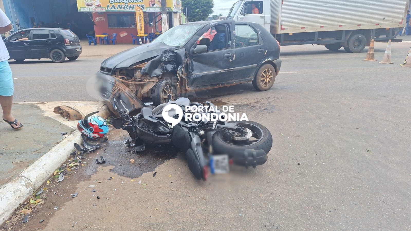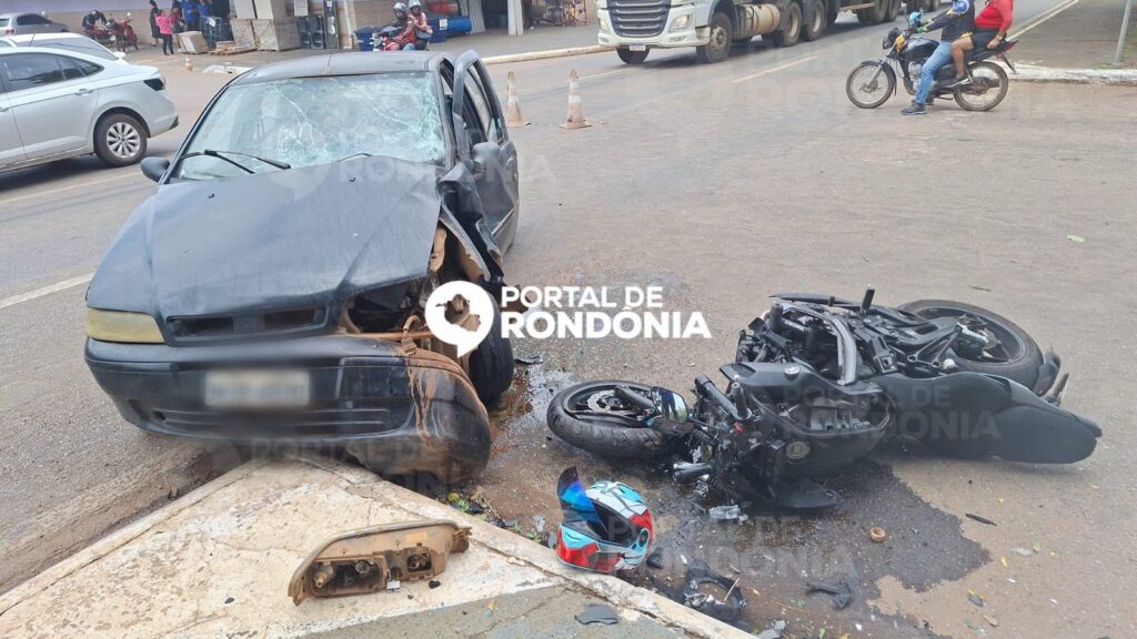 Um grave acidente envolvendo carro e moto foi registrado na manhã desta segunda-feira (12/11), no cruzamento da avenida Jorge Teixeira com rua Álvaro Maia, em Porto Velho.