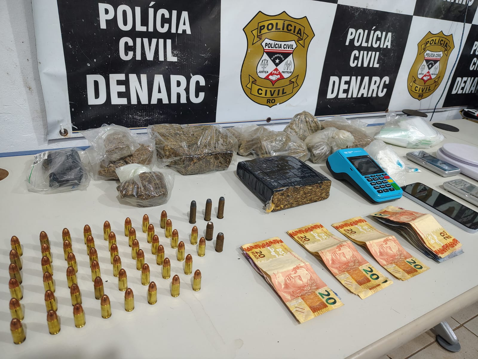 Durante a ação, a companheira do investigado, A. C. S. F., foi presa após a localização de entorpecentes, munições e materiais típicos do tráfico de drogas. No interior da residência foram apreendidos aproximadamente 2,7 kg de maconha, cerca de 100 g de cocaína em pó, balanças de precisão, máquina de cartão, sacos plásticos utilizados para fracionamento de drogas, além de munições de diversos calibres e R$ 339,00 em dinheiro.