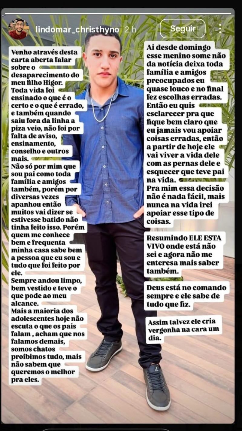 No dia seguinte, o pai do jovem decidiu se pronunciar e publicou uma carta aberta sobre o desaparecimento do filho, enfatizando a atitude que tomou diante da situação. Ele relatou que sempre procurou oferecer estrutura, cuidado e conselhos ao adolescente, mas destacou que Higor teria feito “escolhas erradas”, contrariando as orientações da família. Por essa razão, o pai afirmou que não irá mais apoiar comportamentos que considera inadequados.