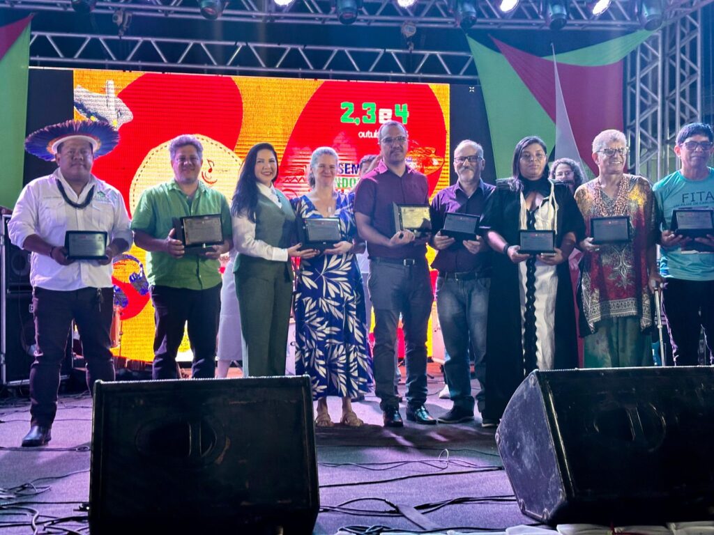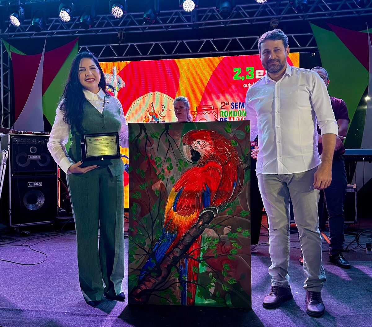 Durante a cerimônia, a deputada Cristiane Lopes recebeu uma homenagem pelo seu trabalho em defesa do desenvolvimento de Rondônia e pela parceria com o IFRO. “Recebo essa homenagem com muita gratidão e carinho. O meu compromisso é seguir apoiando iniciativas que transformam vidas por meio da arte, da educação e da cultura”, declarou.