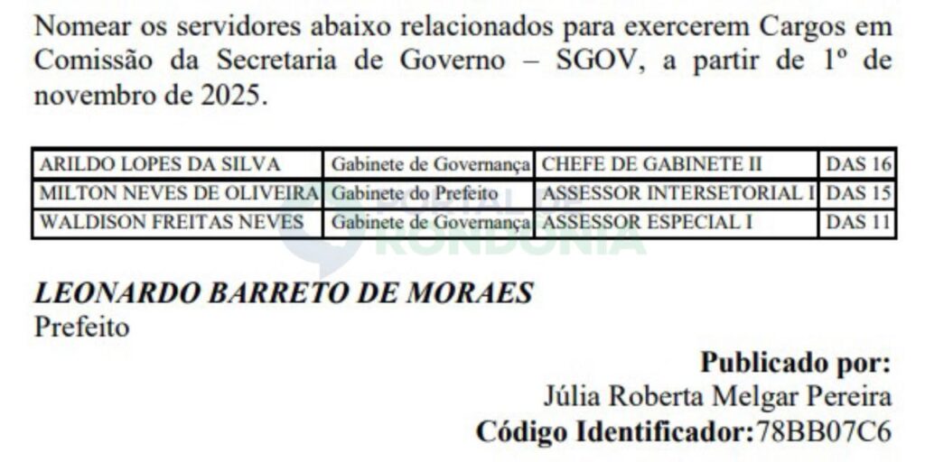 De acordo com informações apuradas pela equipe do Jornal Eletrônico Portal de Rondônia, a mudança marca uma nova etapa na trajetória profissional de Arildo, que deixa o Legislativo estadual para atuar diretamente na administração do prefeito Léo Moraes. Reconhecido pelo perfil técnico e conciliador, ele é conhecido por manter bom relacionamento com a imprensa e órgãos de controle.